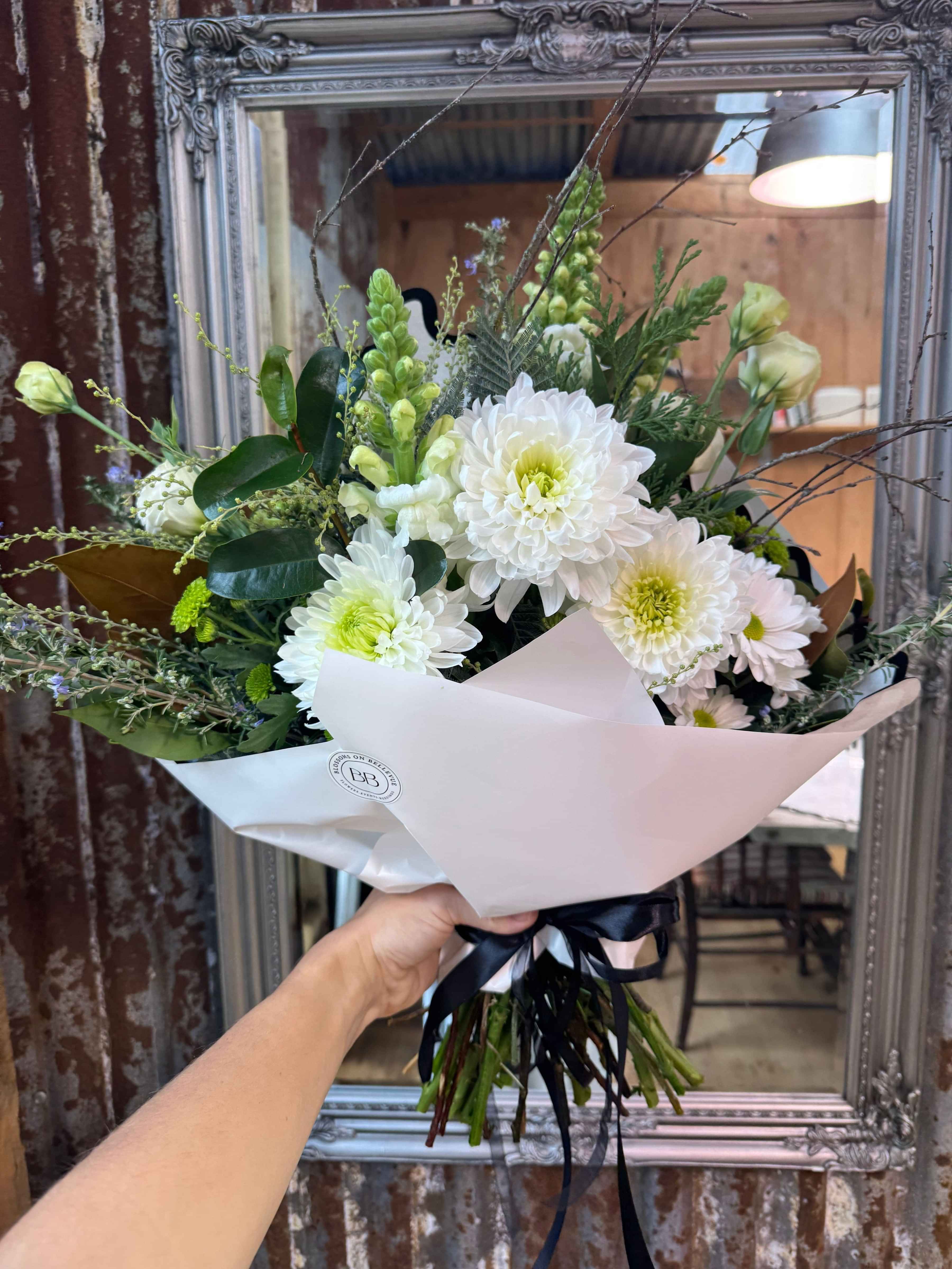 Please note: the photos shown are a guide only. Due to seasonal availability, exact flowers may vary. Each bouquet is a unique creation inspired by the style pictured, not an exact replica.